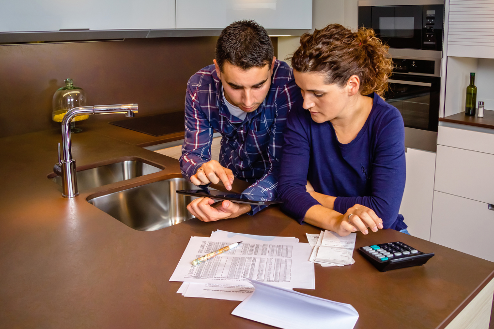 Couple reviewing bills at a kitchen